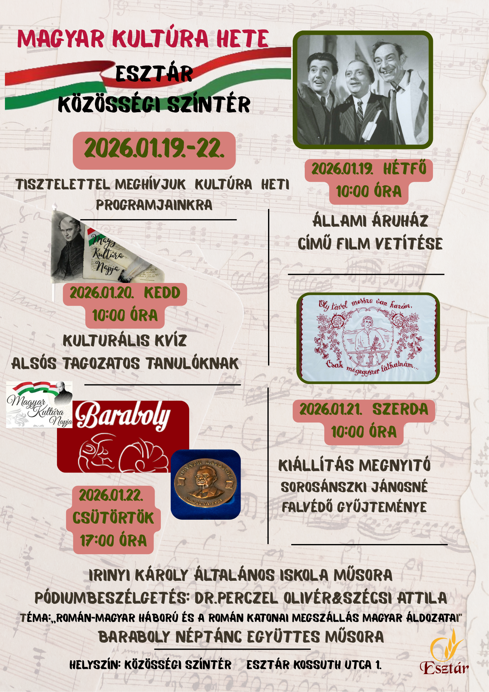 MAGYAR KULTÚRA HETE – ESZTÁR HETI PROGRAMUNK Hétfő 10:00 óra Filmvetítés: Állami áruház Kedd 10:00 óra Kulturális vetélkedő alsós tagozatos