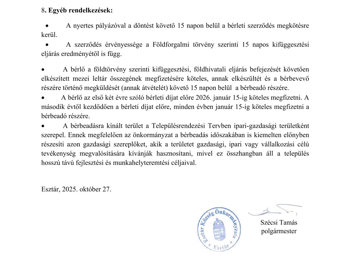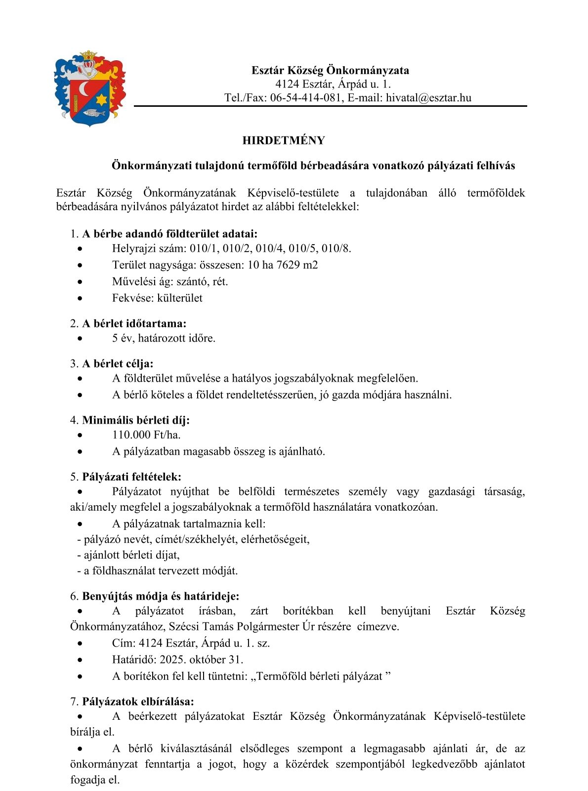 HIRDETMÉNY: Önkormányzati tulajdonú termőföld bérbeadására vonatkozó pályázati felhívás (határidő hosszabbítás) 2025.10.27.Hírek,Önkormányzat,Pályázatok Letölthető: Föld bérbeadás hirdetmény II.
