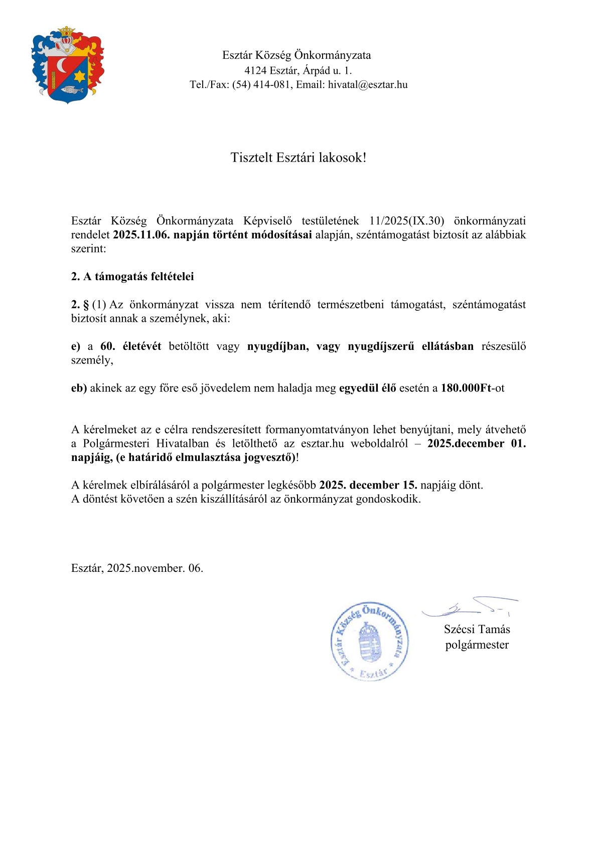 Tájékoztató 2025. évi széntámogatásról II. KÖR 2025.11.12.Civil oldal,Esztár infó,Felhívások,Hírek,Önkormányzat Letölthető: 2025. SZÉN Kérelem