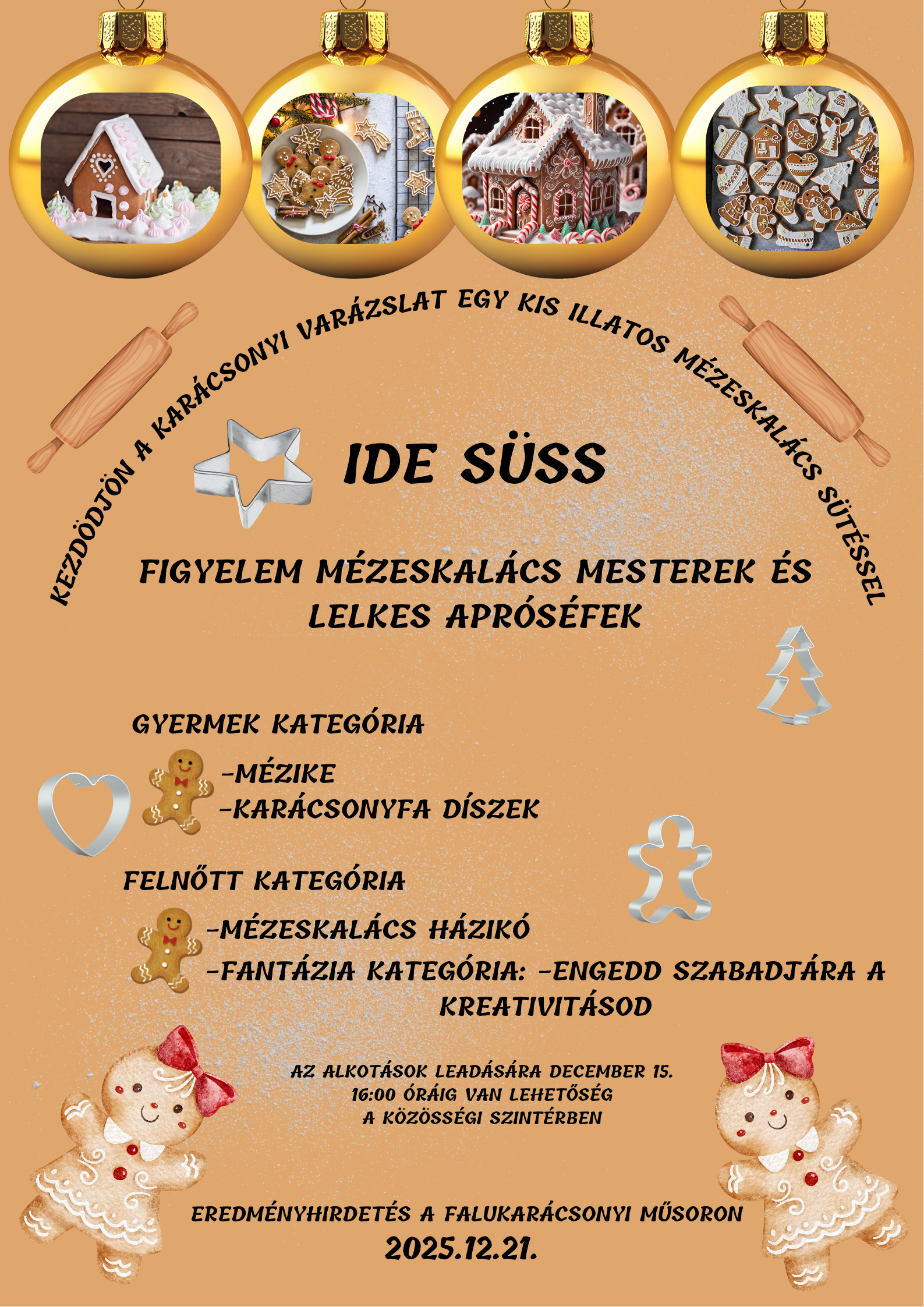 Mézeskalács-sütő verseny! 2025.11.13.Civil kurázsi,Civil oldal,Egyéb kategória,Közösségi élet,Kultúra Mézeskalács-sütő verseny! Kezdődik az ünnepi készülődés — idén is várjuk a lelkes sütni szeretőket mézeskalács-versenyünkre!